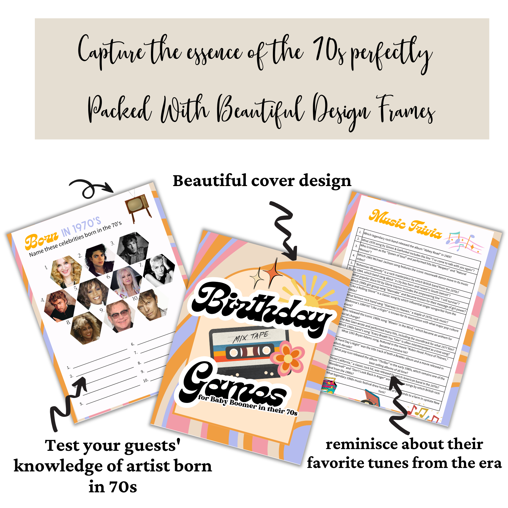 Step back in time to the iconic eras of the 70s and 80s with our specially curated birthday games pack designed to transport baby boomers to their youthful days of fun and nostalgia. Relive the memorable moments, fashion trends, music beats, and timeless games that defined an entire generation.