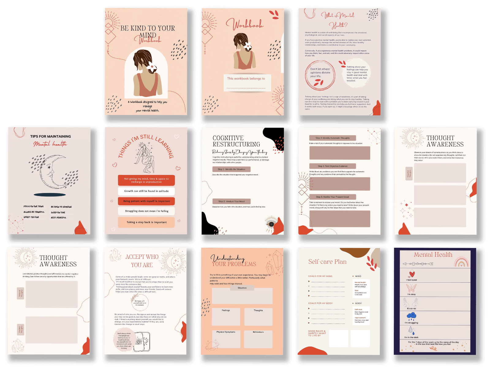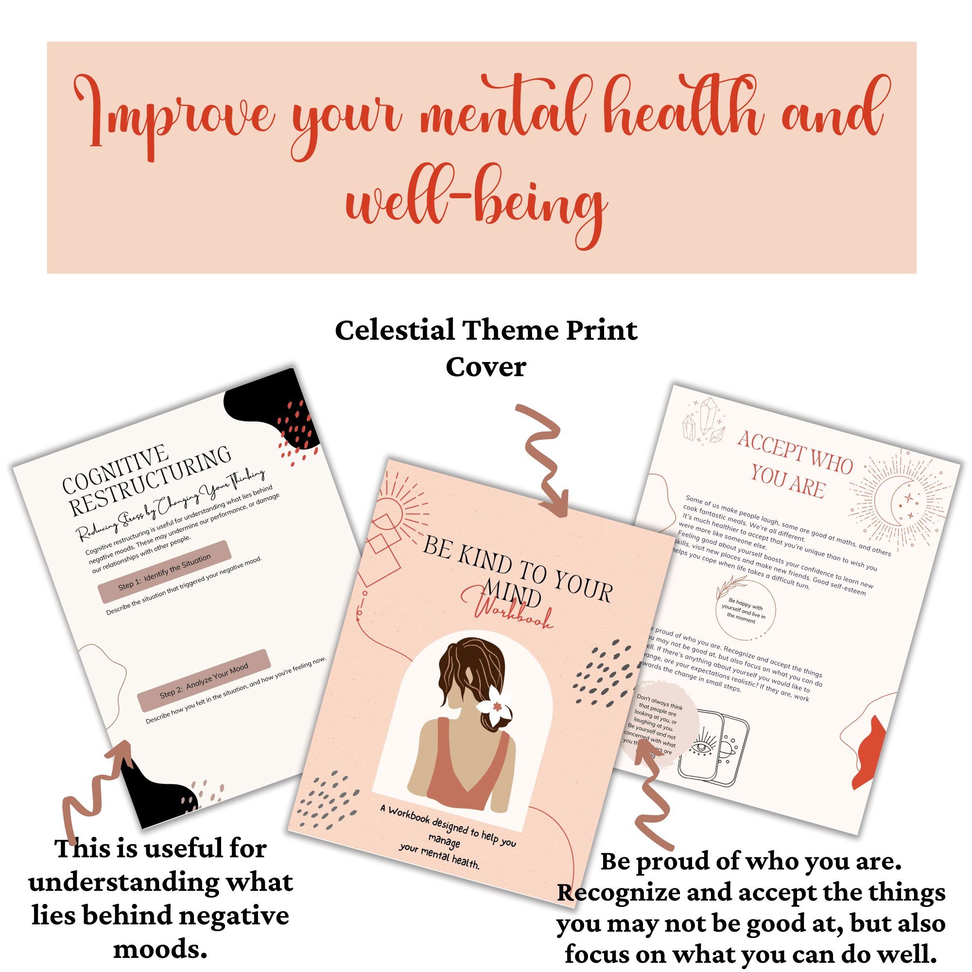 Improve your mental health and well-being through this guided journaling workbook. This Be Kind to your Mind Workbook Planner will show you how to prioritize your needs and support your mental health, encouraging you to deepen your self-awareness and develop healthier thinking patterns so you can truly thrive. It incorporates 13 pages worksheets for mental health, and space to write down your reflections and thoughts.