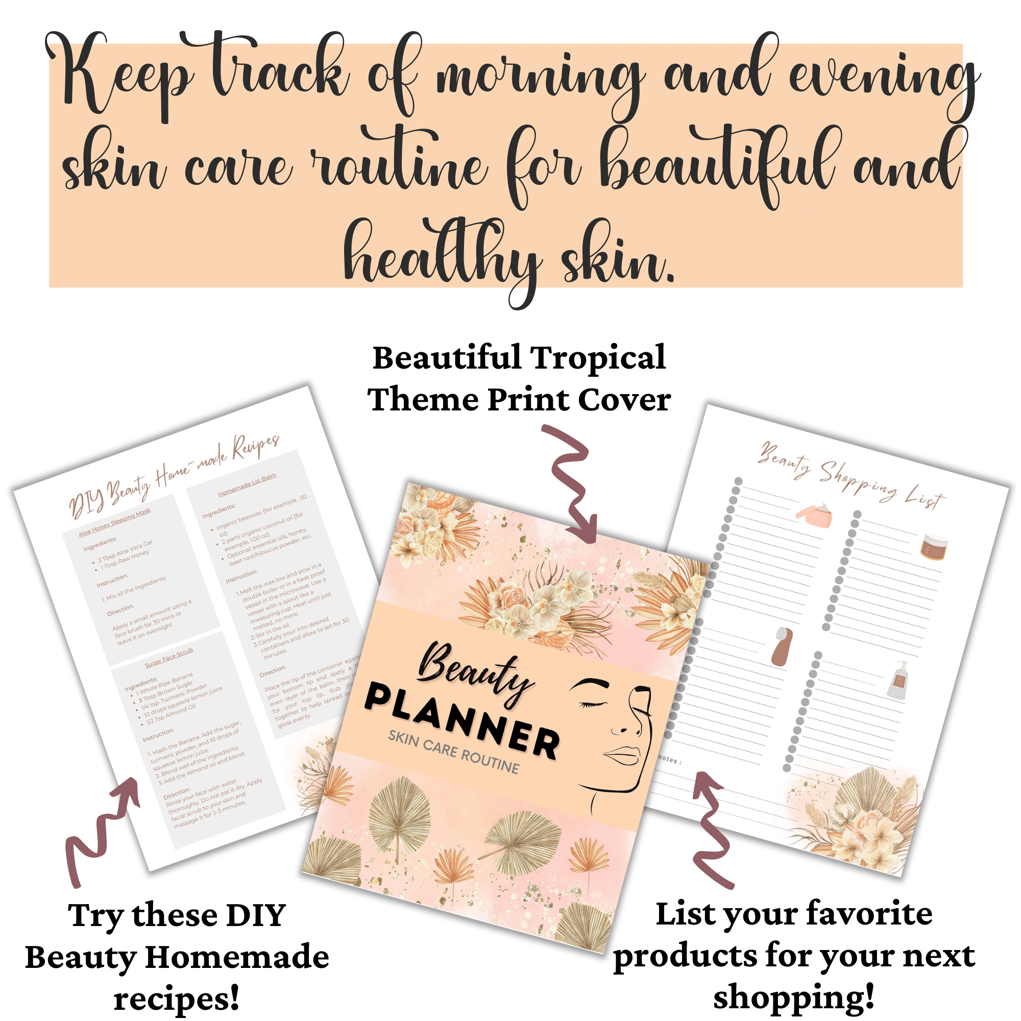 Keep track of morning and evening skin care routine for beautiful and healthy skin. This Beauty Skincare Routine Planner will help you plan your beauty and skincare routine in a stress-free manner. Feel beautiful about yourself and your life! It incorporates 13 pages to help you make your self-care transformation achievable.